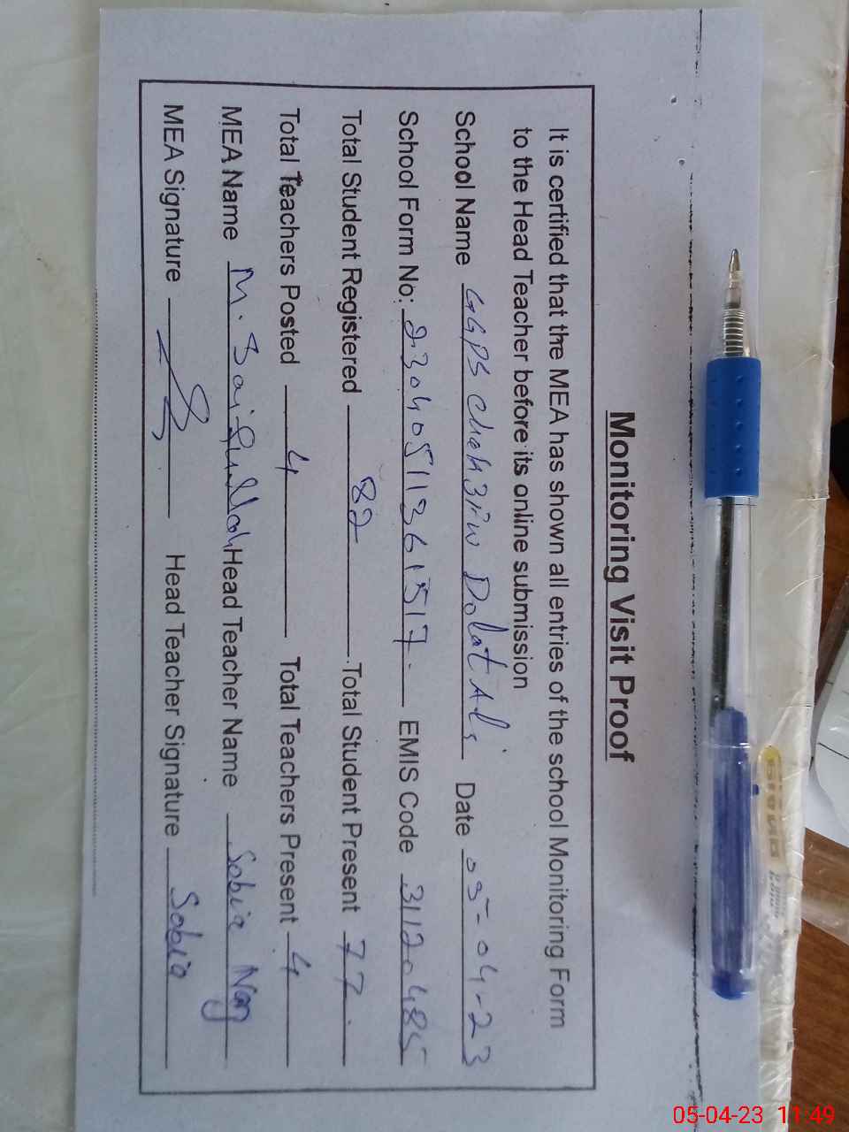 | Attendance Register | Head Teacher | MEA with School | Visit Proof |