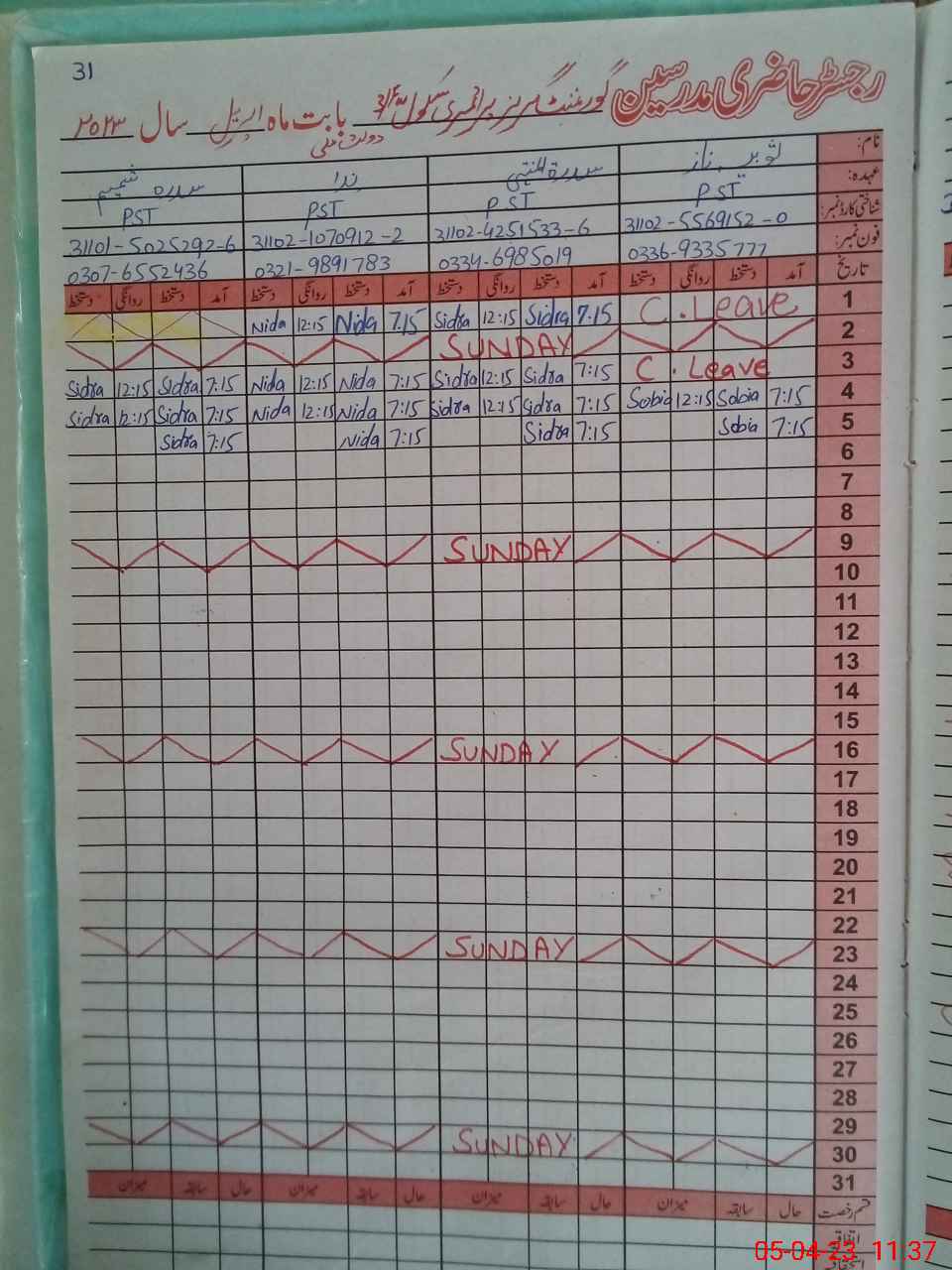 | CNIC | Full Name | Designation | R/C | Absence During Last Calender Month |