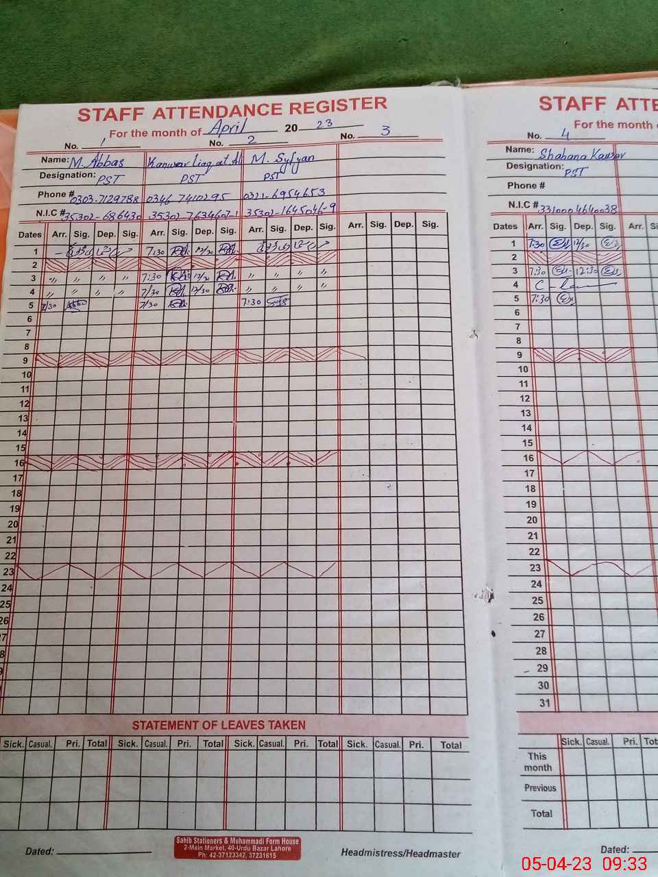 | CNIC | Full Name | Designation | R/C | Absence During Last Calender Month |