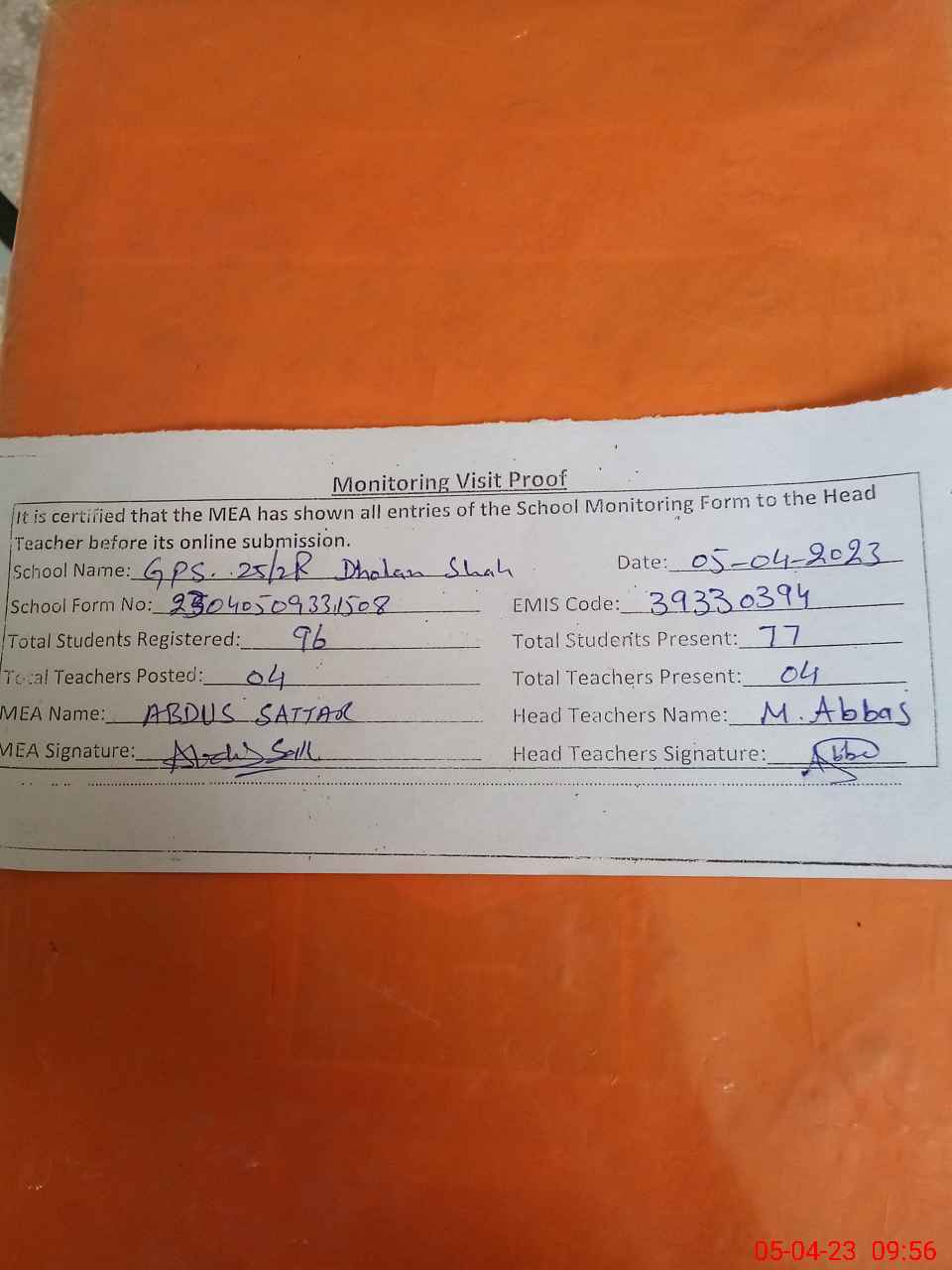 | Attendance Register | Head Teacher | MEA with School | Visit Proof |