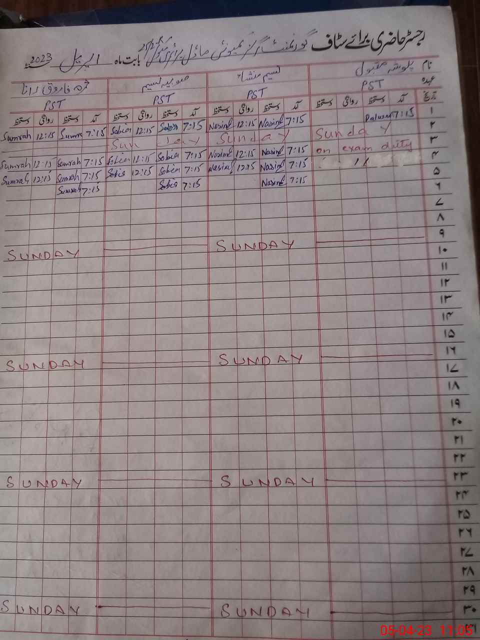 | 35**** | Pa**** Ma**** | PST | Regular | 0 | 0 | 0 | 0 | 0 | 0 | 0 | 0 | 0 | Exam Duty |