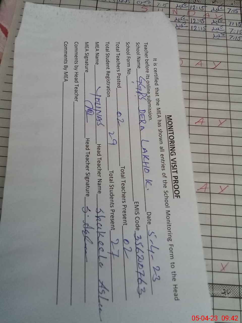 | Attendance Register | Head Teacher | MEA with School | Visit Proof |