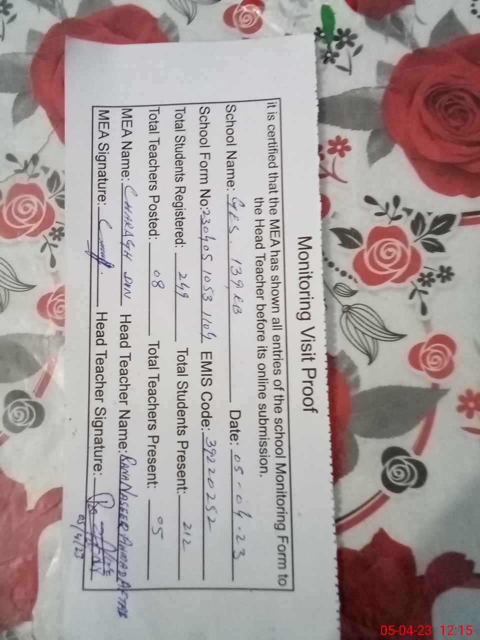| Attendance Register | Head Teacher | MEA with School | Visit Proof |