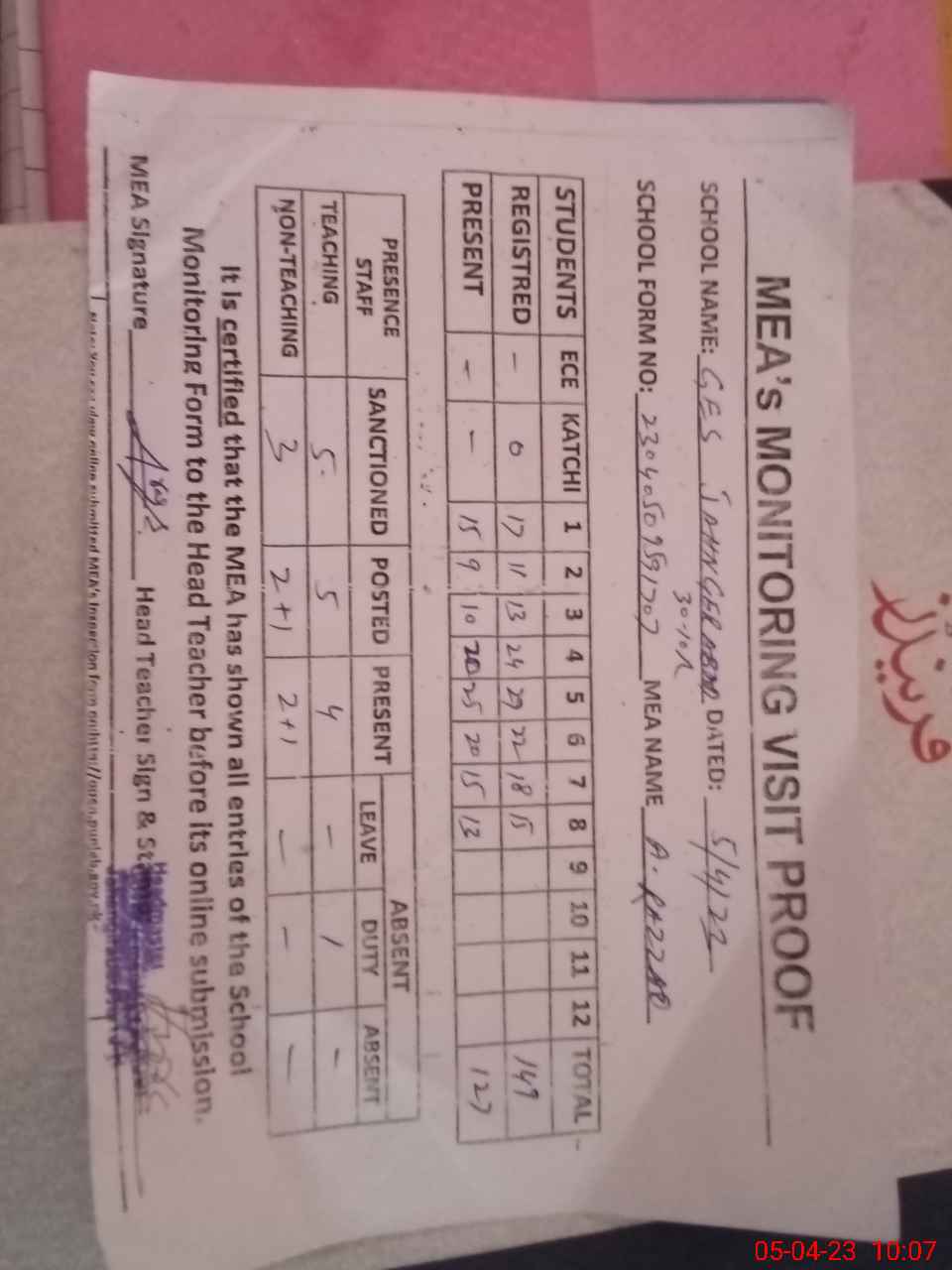 | Attendance Register | Head Teacher | MEA with School | Visit Proof |