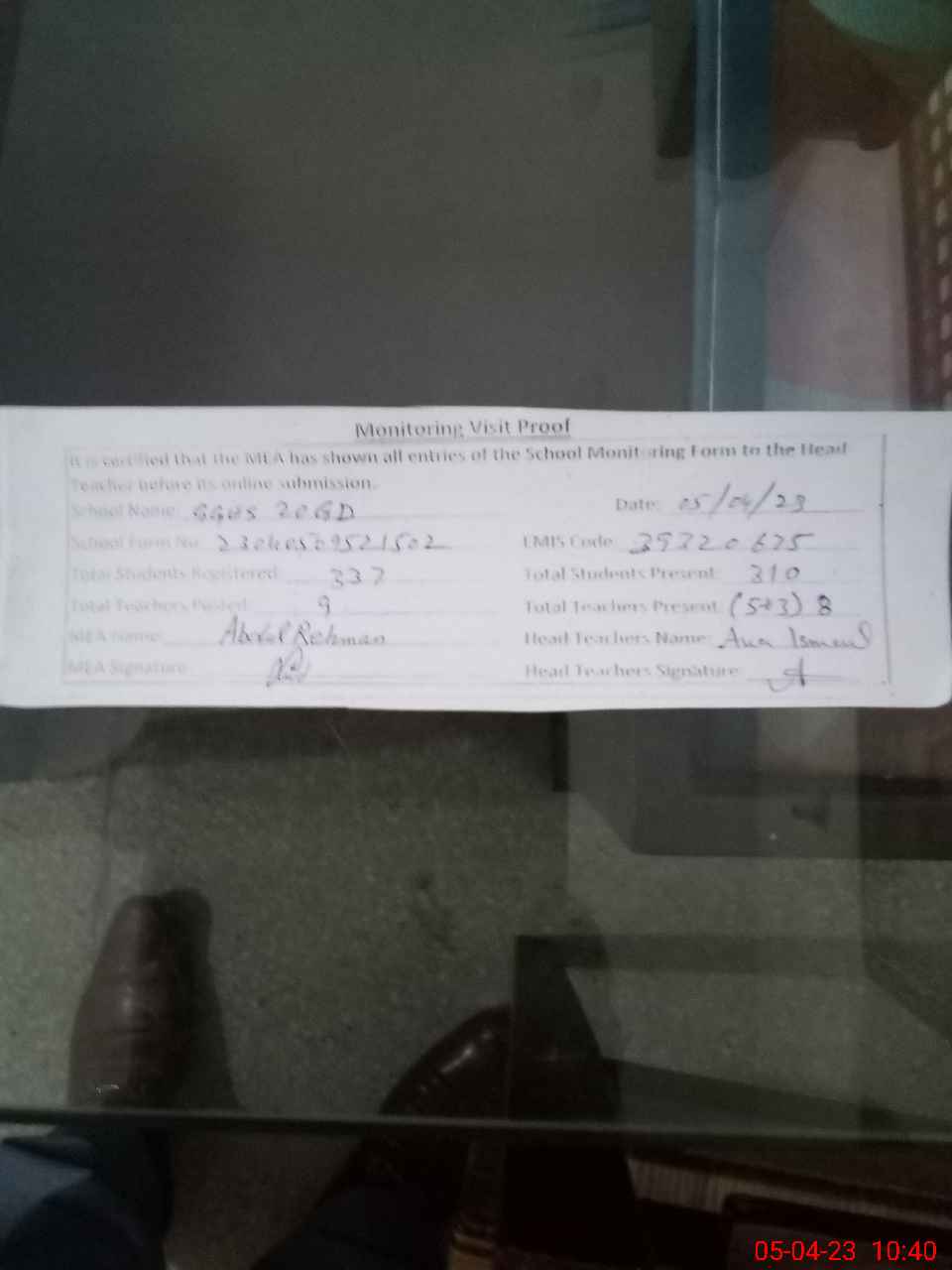 | Attendance Register | Head Teacher | MEA with School | Visit Proof |