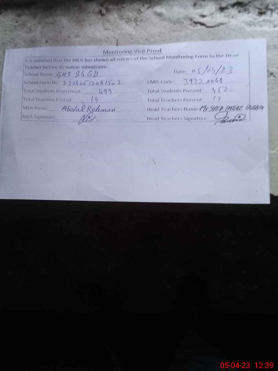 | EMIS Code: 39320044 | Name of School: GHS 24/G.D | |||