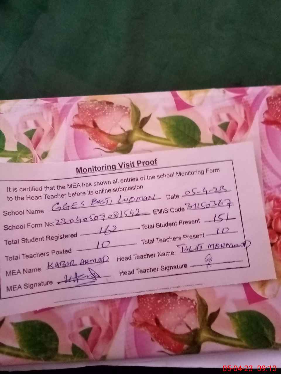 | Attendance Register | Head Teacher | MEA with School | Visit Proof |