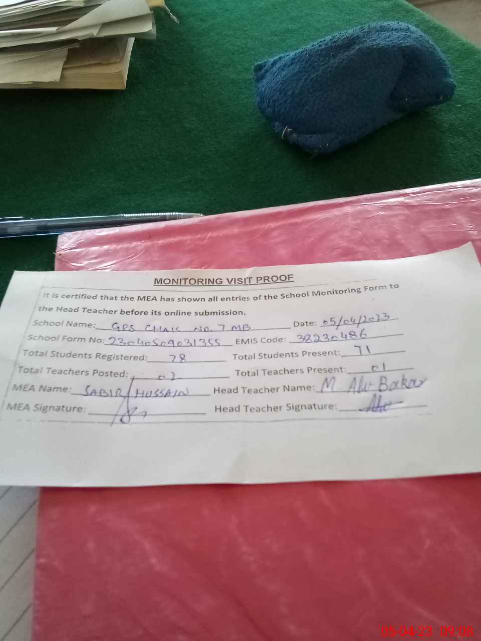 | EMIS Code: 38230486 | Name of School: GPS CHAK NO. 7 MB | |||
