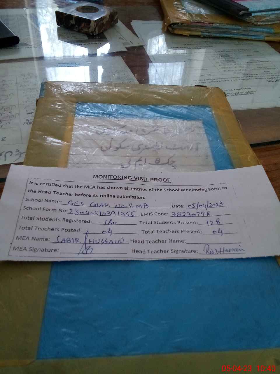 | Attendance Register | Head Teacher | MEA with School | Visit Proof |