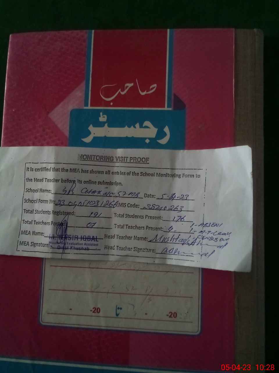 | EMIS Code: 38210263 | Name of School: GPS CHAK NO 52 MB | |||