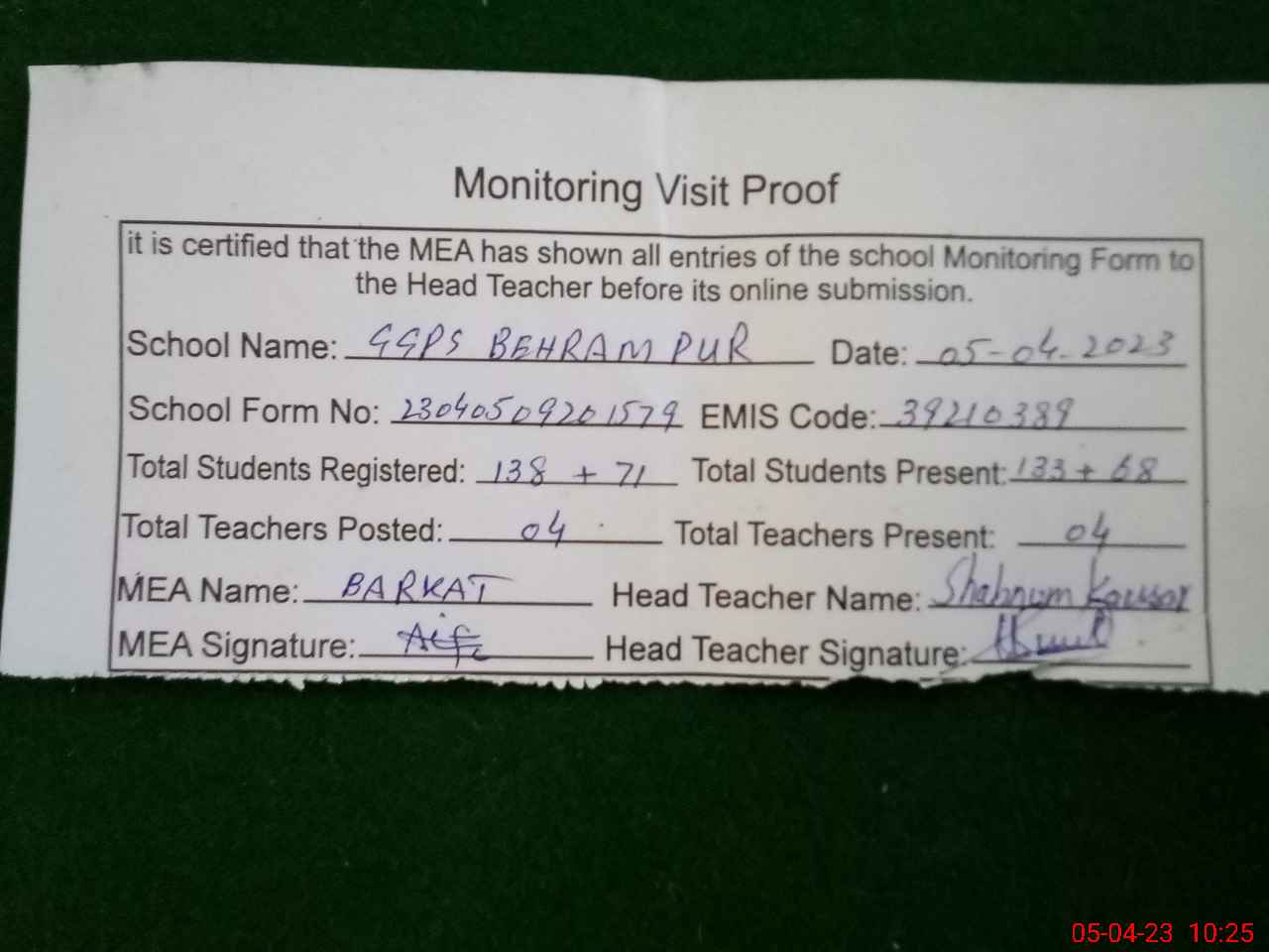| Attendance Register | Head Teacher | MEA with School | Visit Proof |