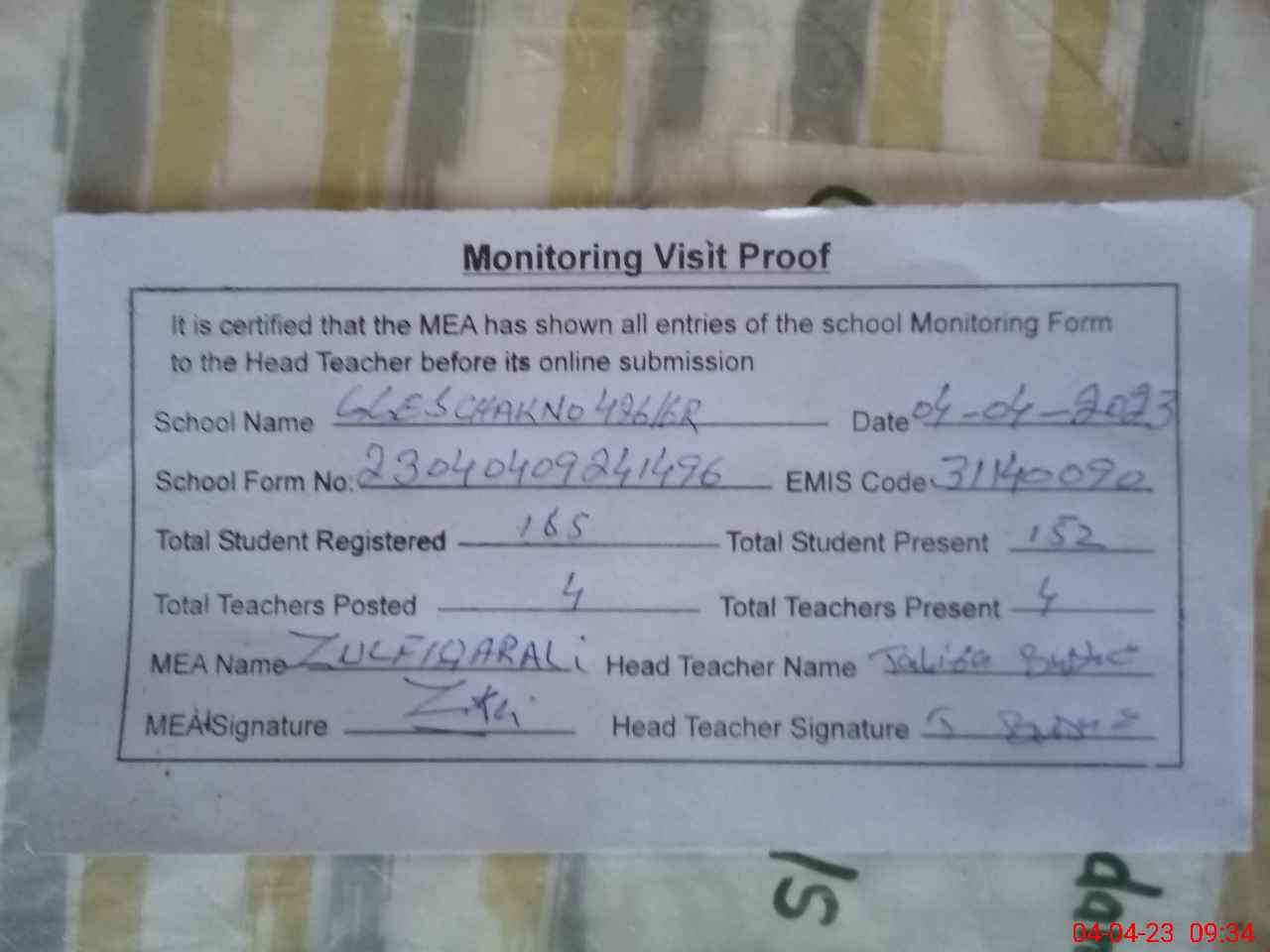 | Attendance Register | Head Teacher | MEA with School | Visit Proof |