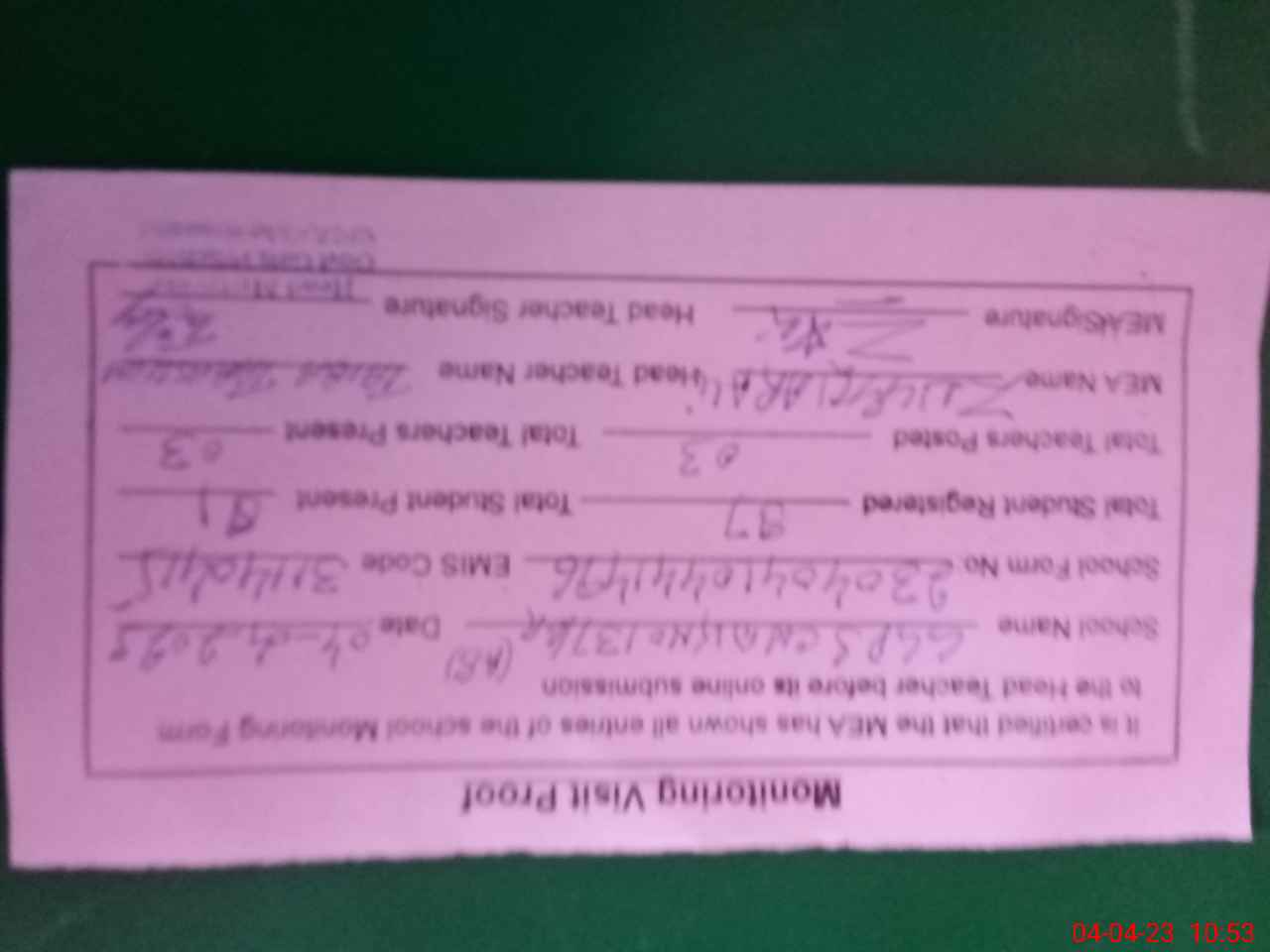 | Attendance Register | Head Teacher | MEA with School | Visit Proof |