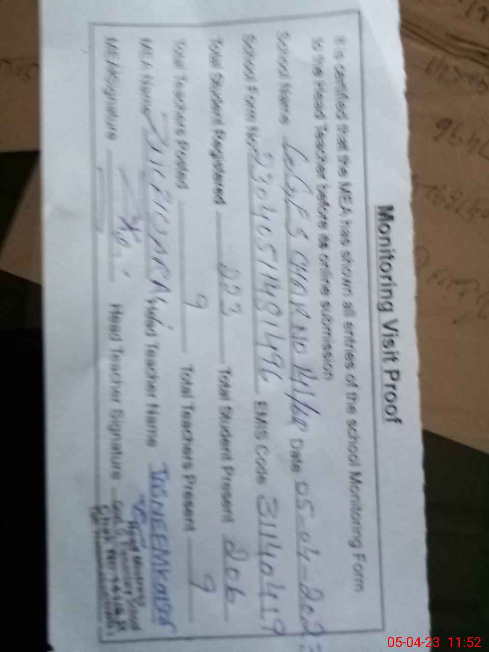 | Attendance Register | Head Teacher | MEA with School | Visit Proof |
