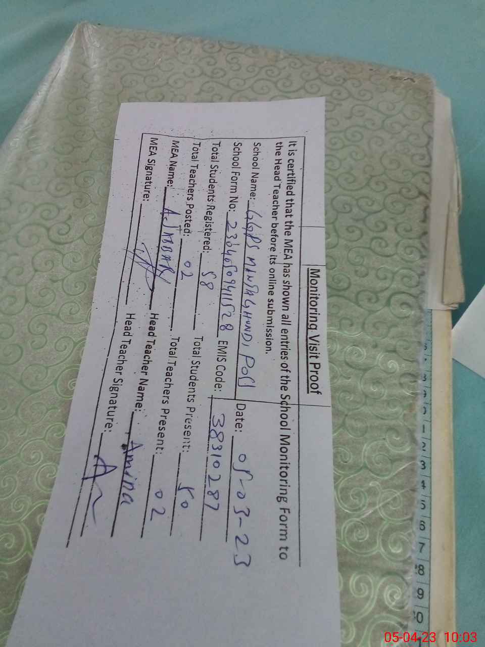 | Attendance Register | Head Teacher | MEA with School | Visit Proof |