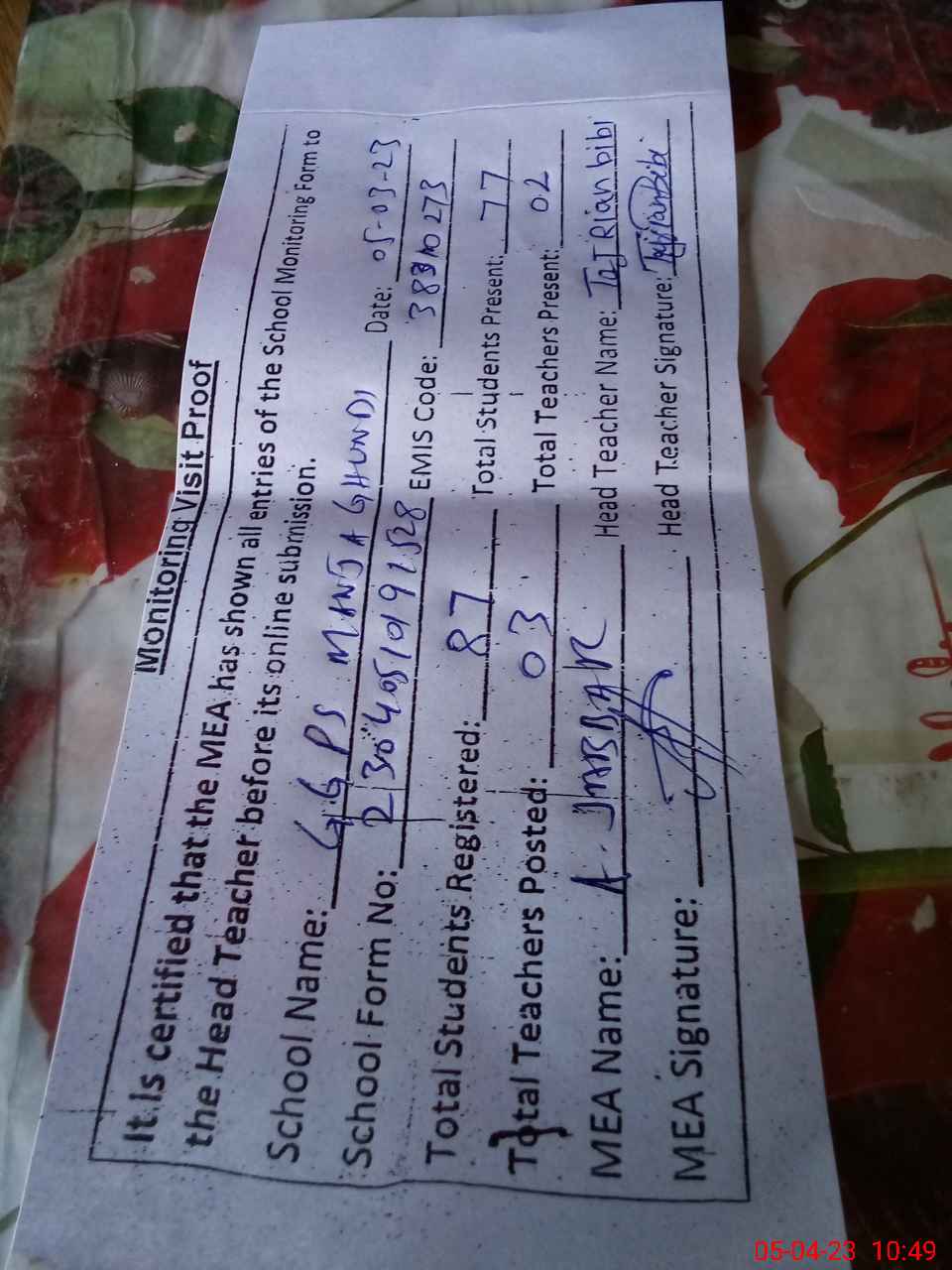 | Attendance Register | Head Teacher | MEA with School | Visit Proof |