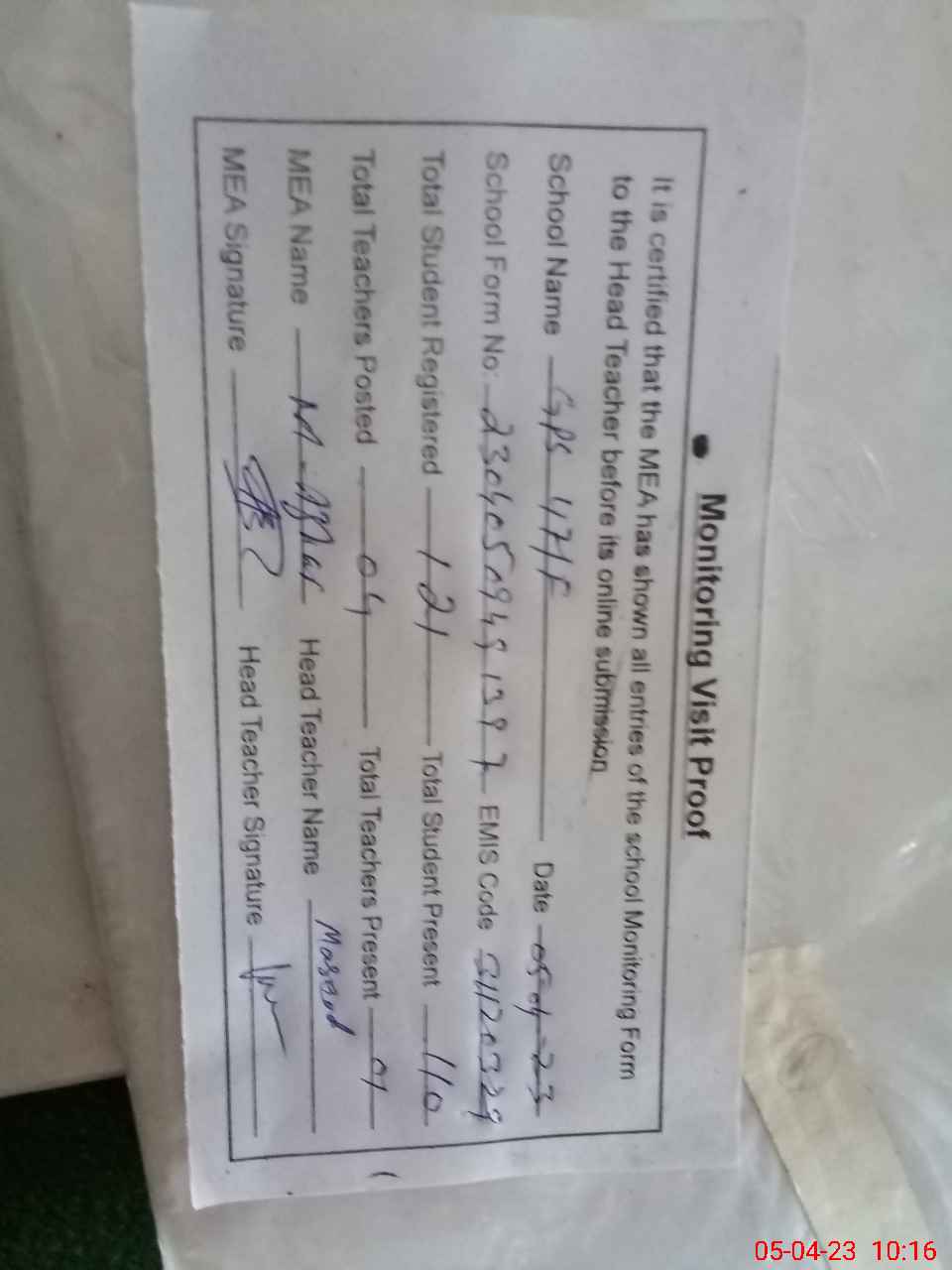 | Attendance Register | Head Teacher | MEA with School | Visit Proof |