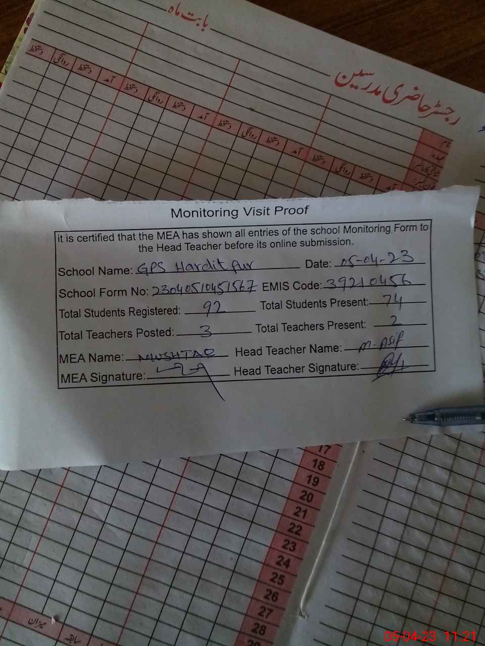 | Attendance Register | Head Teacher | MEA with School | Visit Proof |