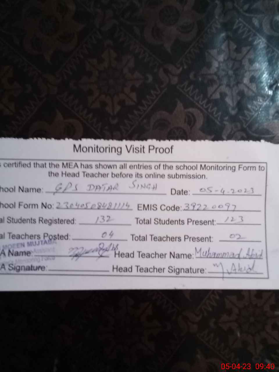 | Monitoring Date: 05-04-2023 | Start Time: 05-04-2023 08:48 AM | End Time: 05-04-2023 09:40 AM | Name of MEA: Gh**** Mu**** Mu**** (R**** | |