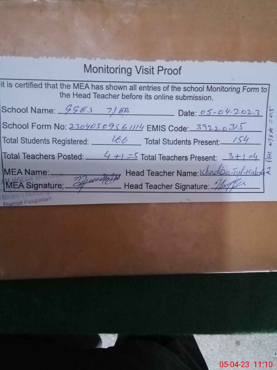 | Attendance Register | Head Teacher | MEA with School | Visit Proof |