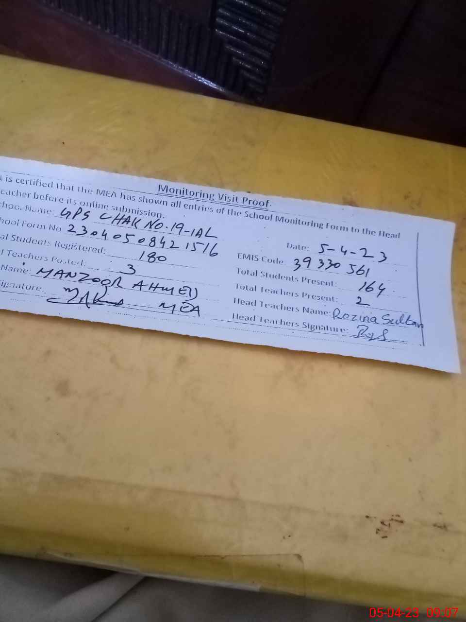 | EMIS Code: 39330561 | Name of School: GGPS CHAK NO. 19/1-AL | |||