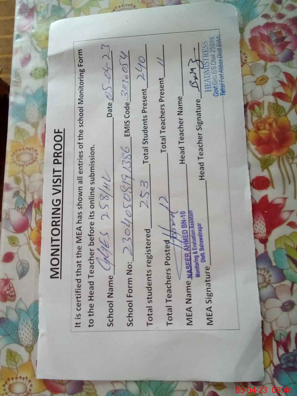 | Attendance Register | Head Teacher | MEA with School | Visit Proof |