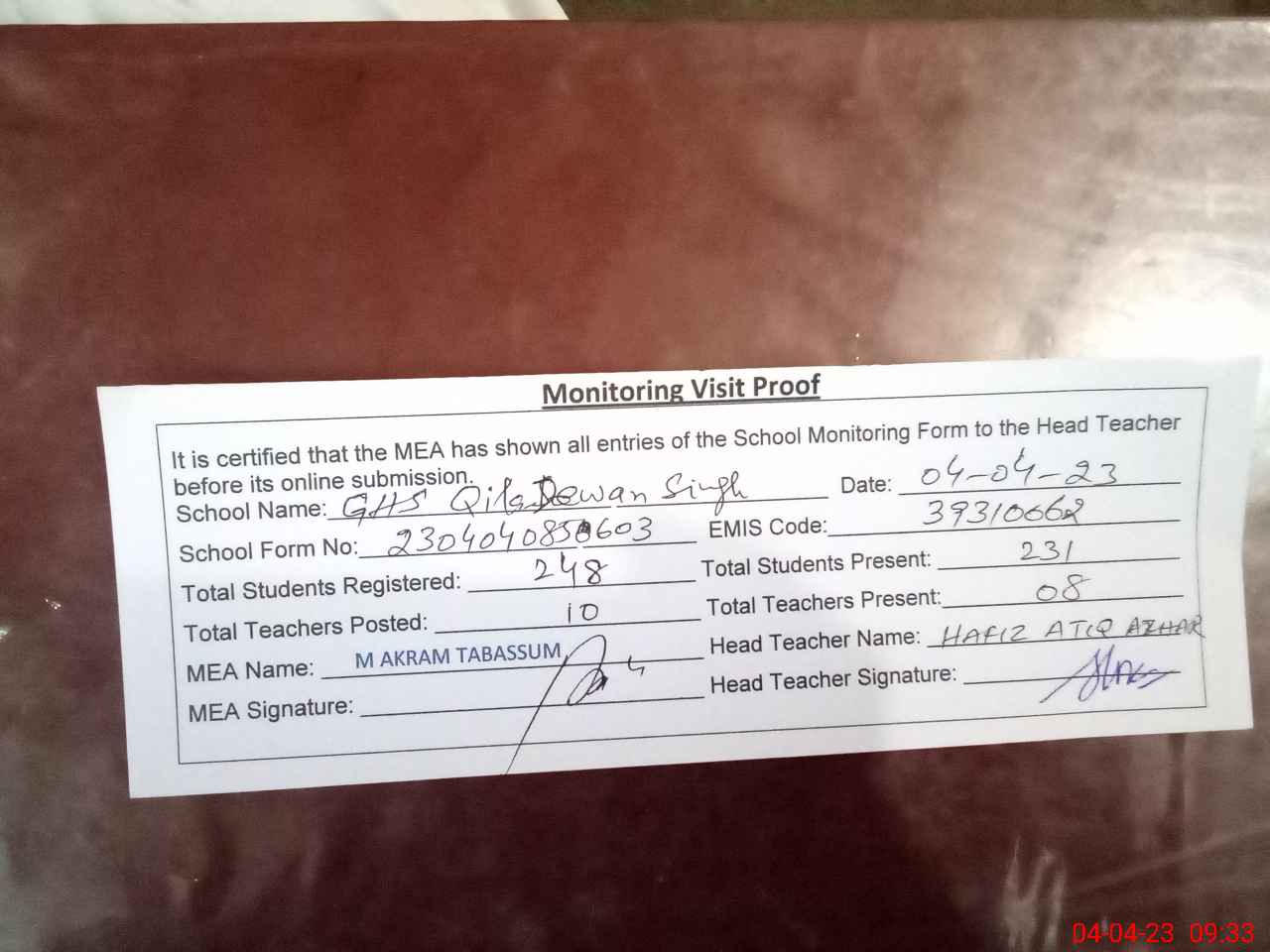 | Attendance Register | Head Teacher | MEA with School | Visit Proof |