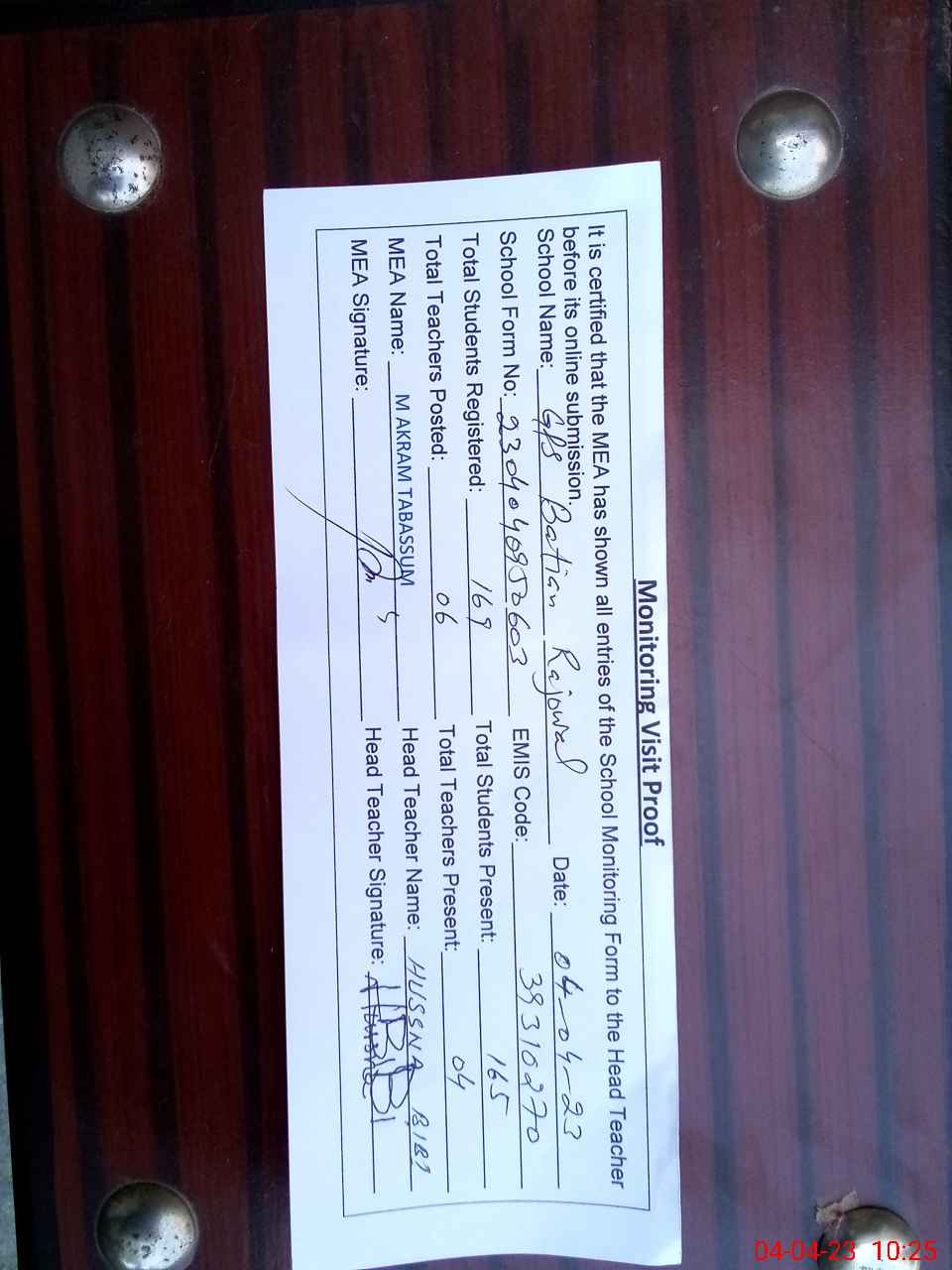| Certified that this School was Inspected by the Undersigned MEA/DMO Today and the Information Stated Above is as Per Record. | |||||