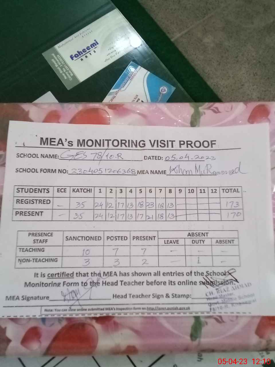 | Attendance Register | Head Teacher | MEA with School | Visit Proof |