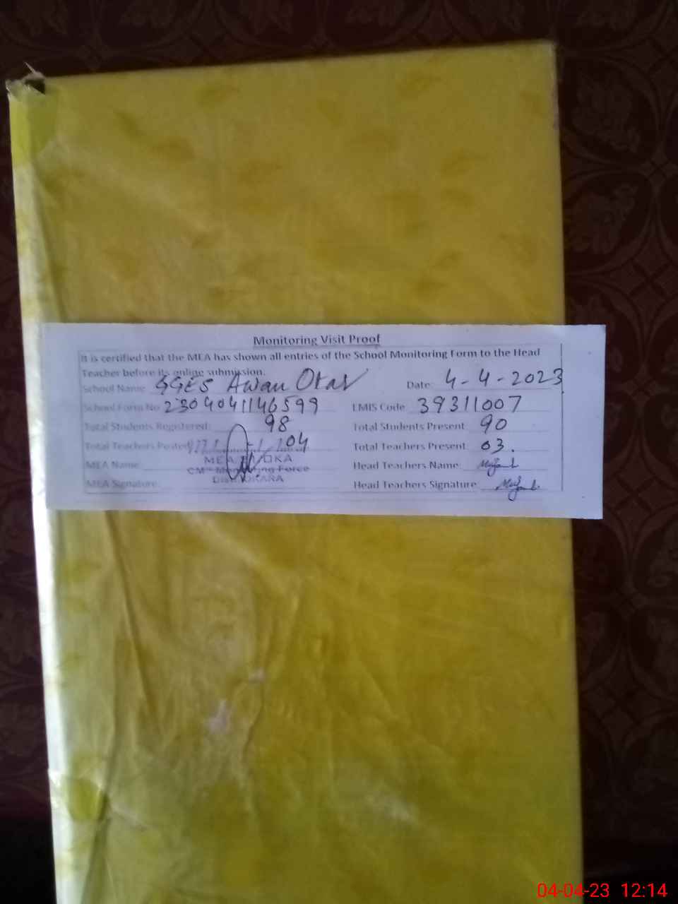 | Attendance Register | Head Teacher | MEA with School | Visit Proof |