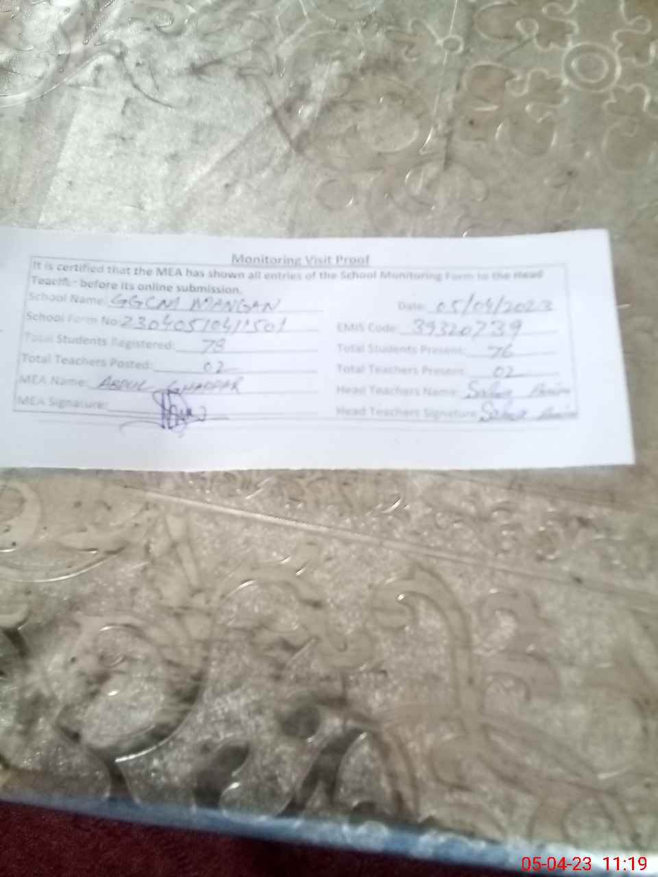 | Attendance Register | Head Teacher | MEA with School | Visit Proof |