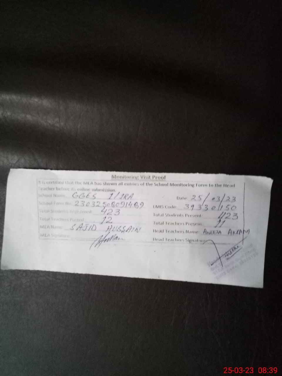 | Attendance Register | Head Teacher | MEA with School | Visit Proof |