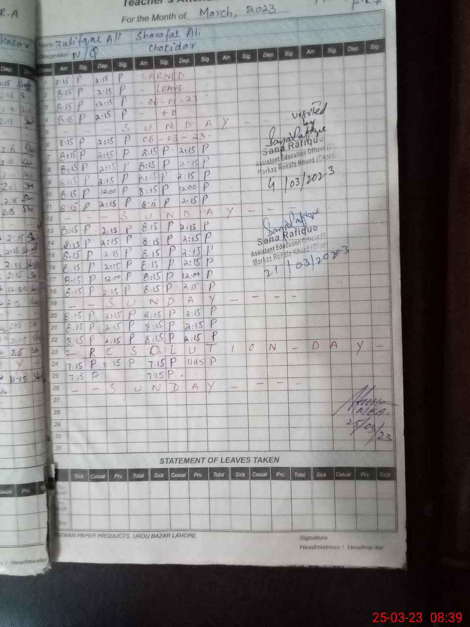 | CNIC | Full Name | Designation | R/C | Absence During Last Calender Month |