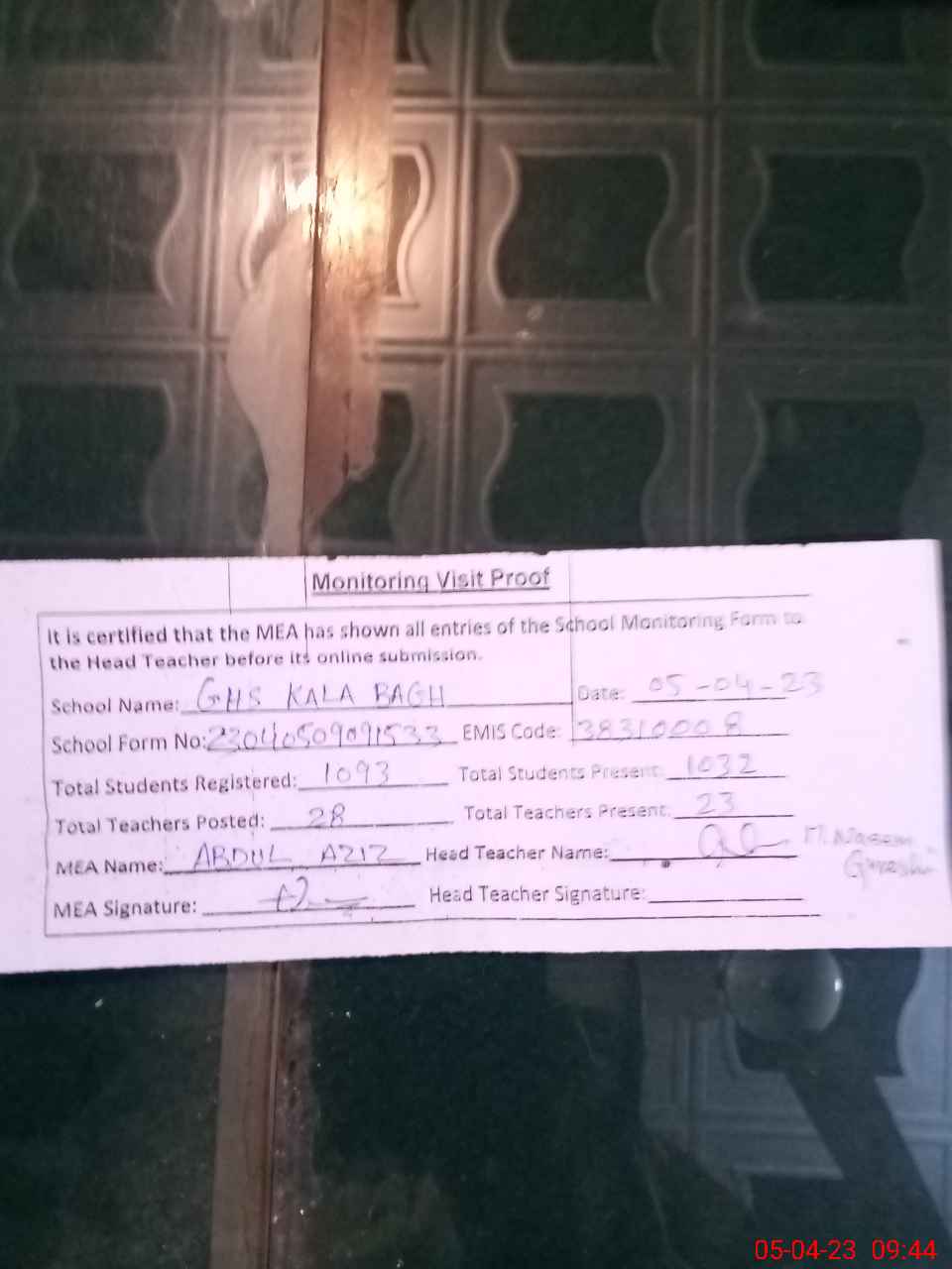 | Attendance Register | Head Teacher | MEA with School | Visit Proof |