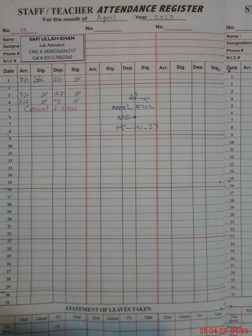 | CNIC | Full Name | Designation | R/C | Absence During Last Calender Month |