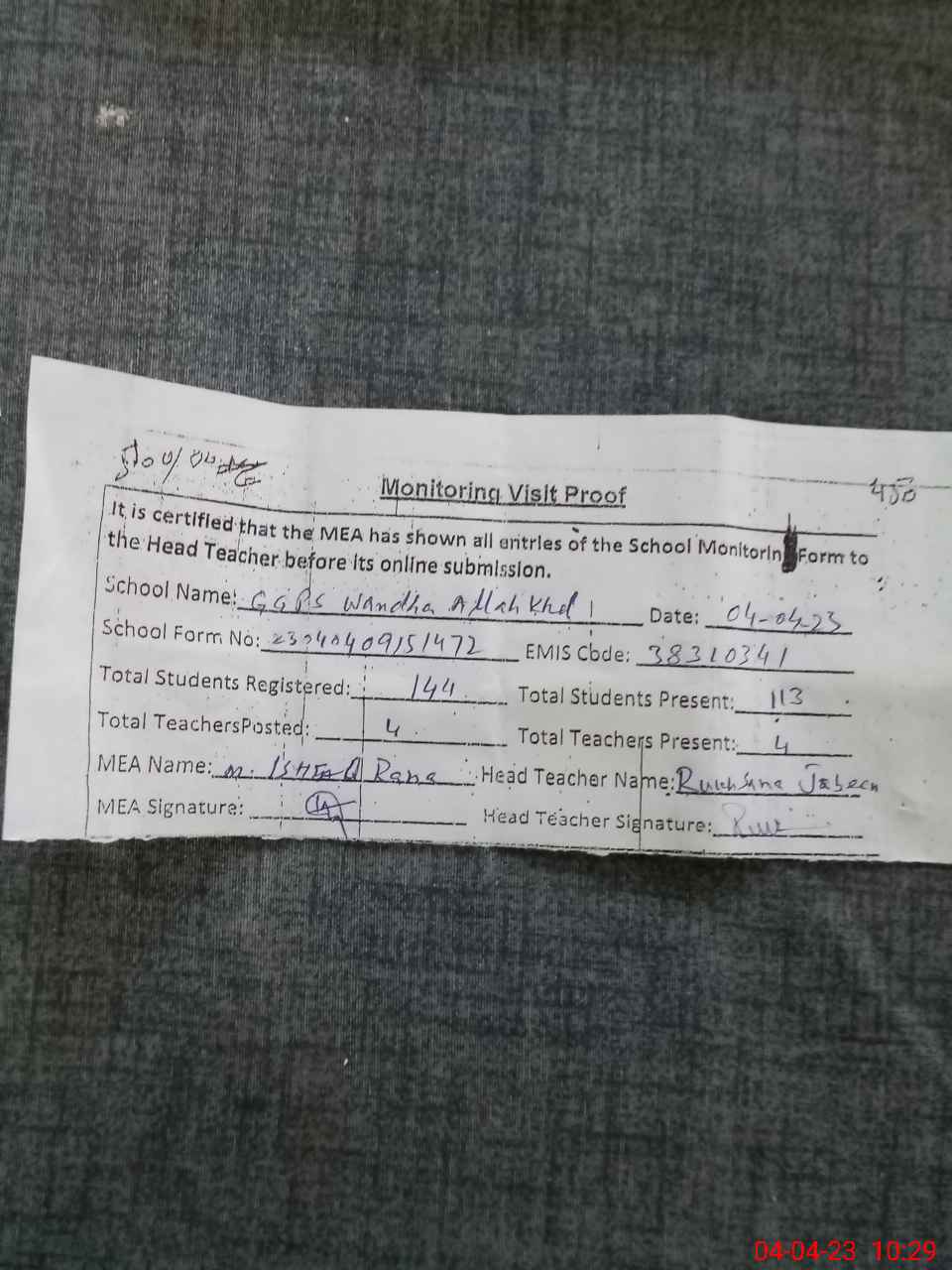 | Attendance Register | Head Teacher | MEA with School | Visit Proof |
