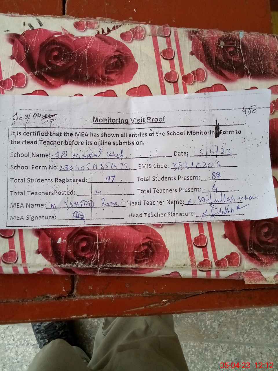 | Attendance Register | Head Teacher | MEA with School | Visit Proof |