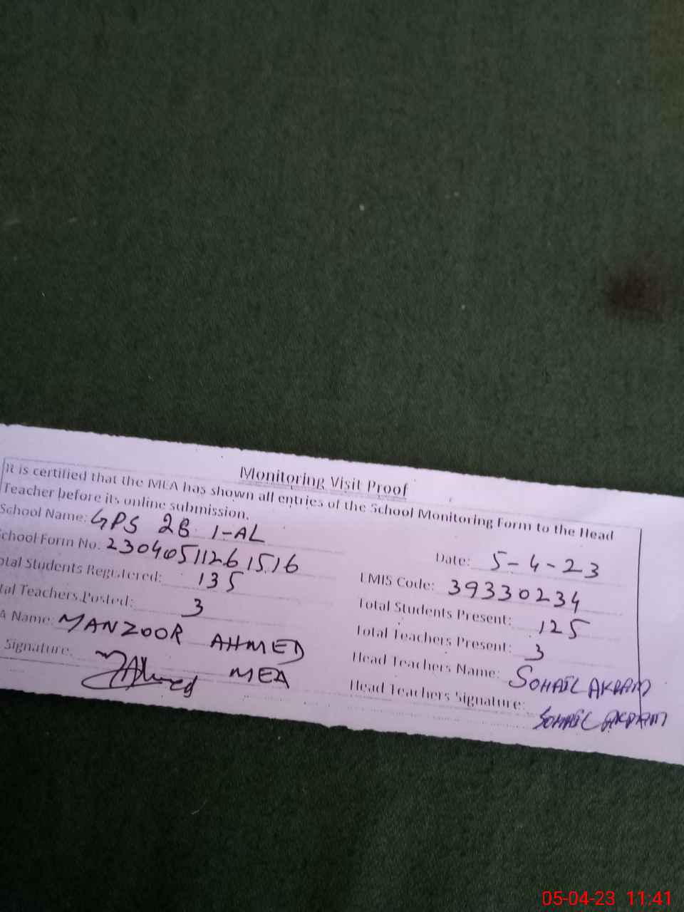 | Attendance Register | Head Teacher | MEA with School | Visit Proof |