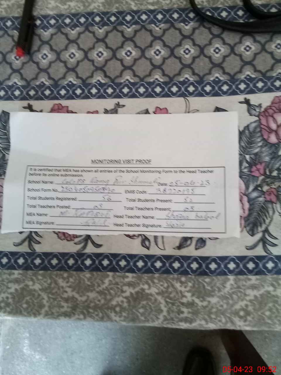 | Attendance Register | Head Teacher | MEA with School | Visit Proof |