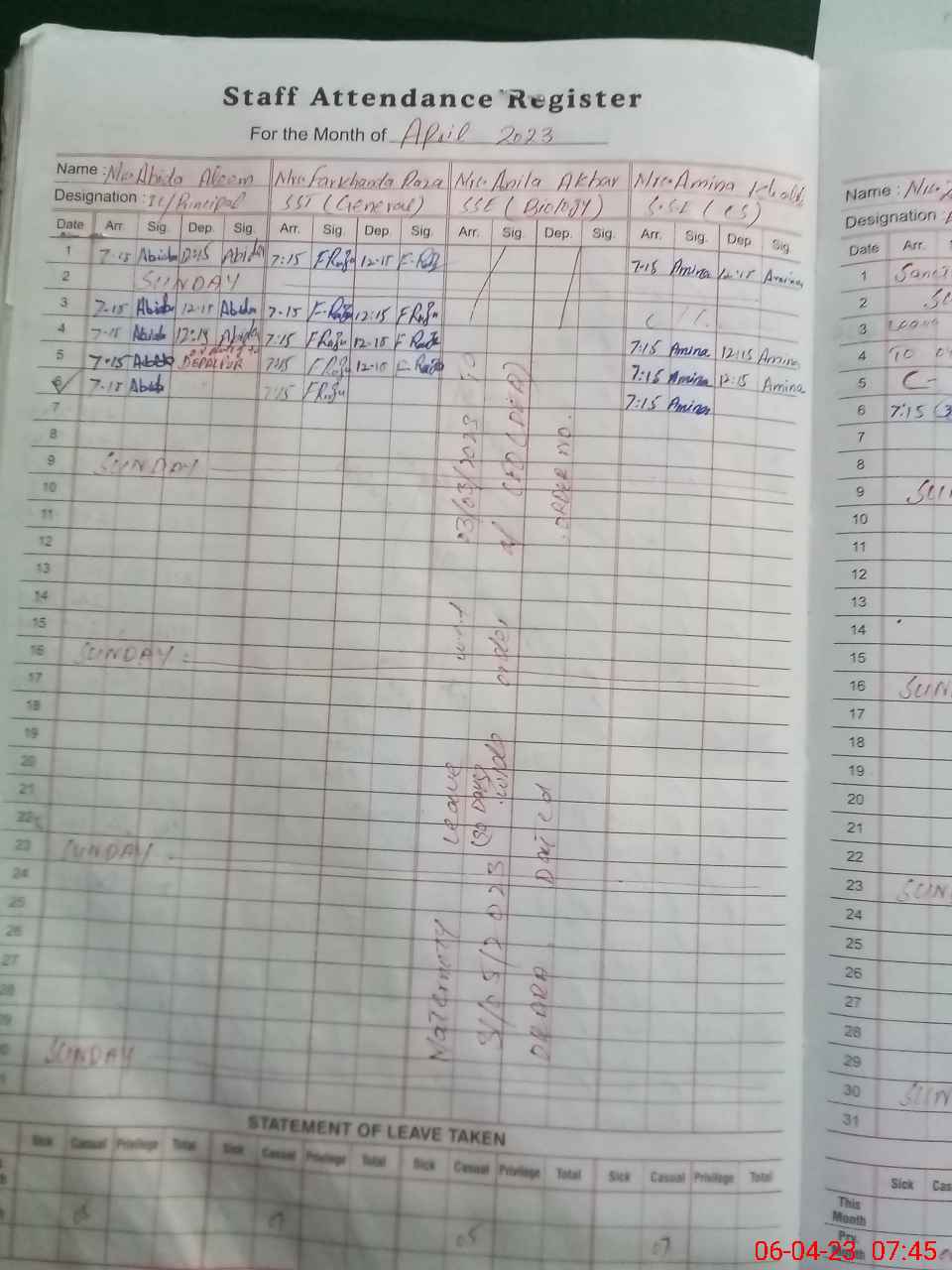 | 36**** | Ka**** Al**** | NQ | Regular | 0 | 0 | 29 | 0 | 0 | 0 | 0 | 0 | 0 | Absent (Un-Authorized) |