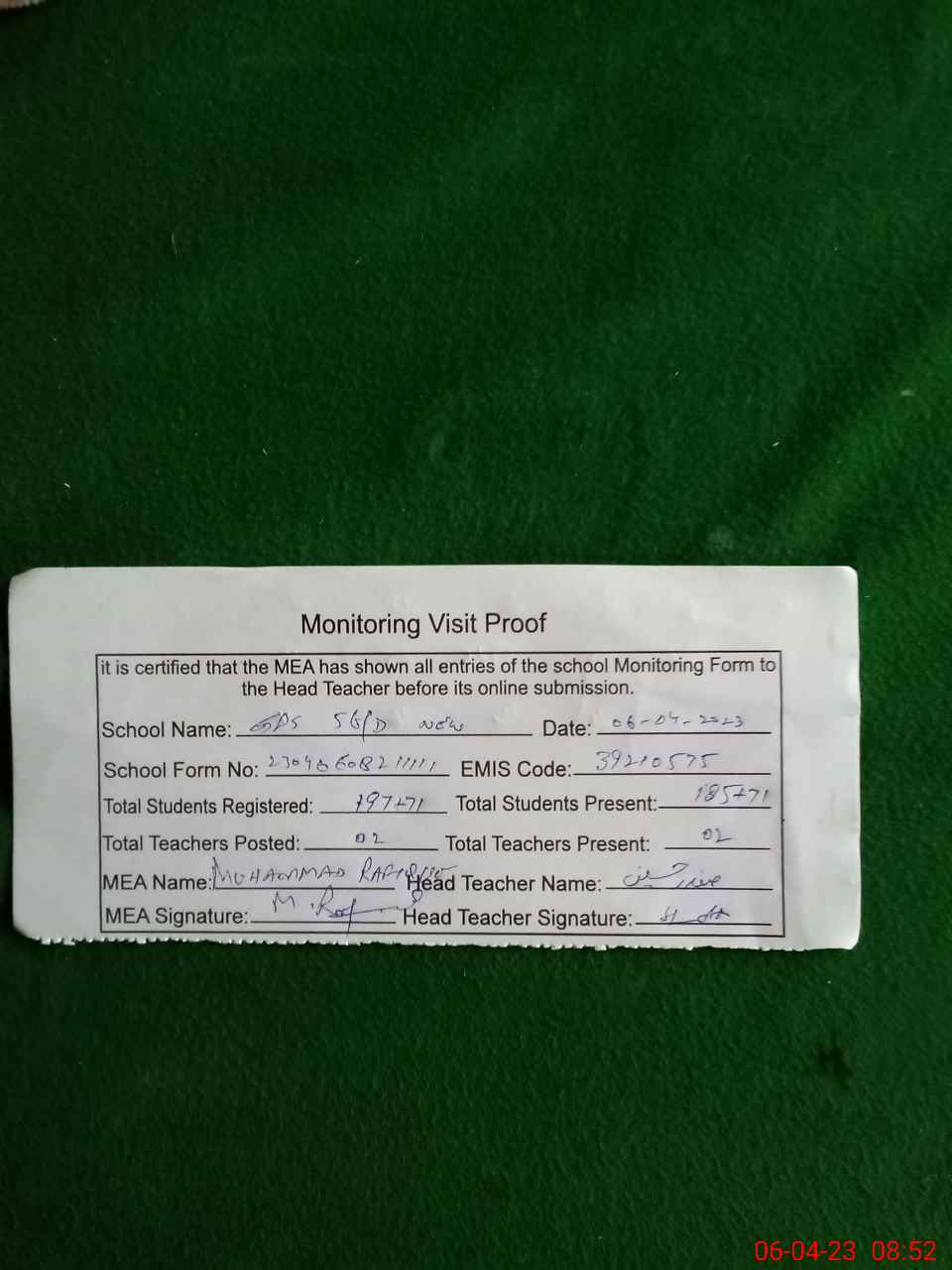 | Attendance Register | Head Teacher | MEA with School | Visit Proof |