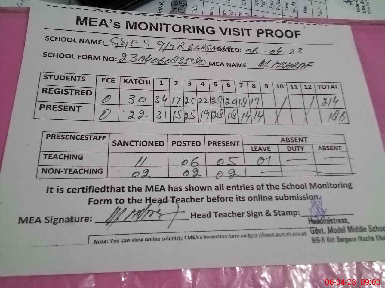 | Attendance Register | Head Teacher | MEA with School | Visit Proof |