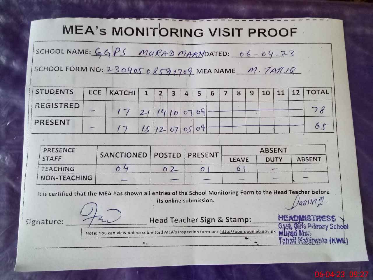 | Attendance Register | Head Teacher | MEA with School | Visit Proof |