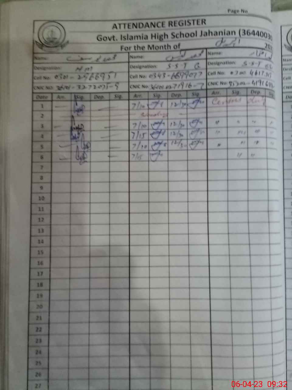 | CNIC | Full Name | Designation | R/C | Absence during last cal. month |