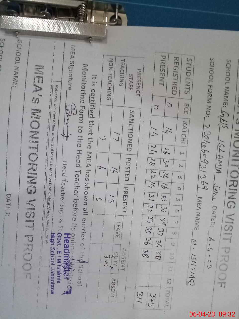 | Attendance Register | Head Teacher | MEA with School | Visit Proof |