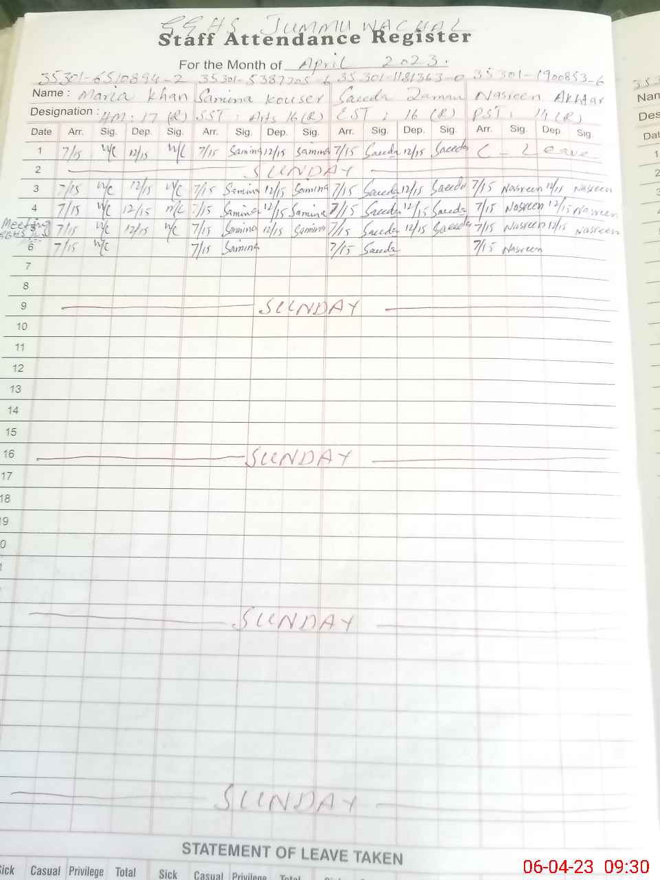 | CNIC | Full Name | Designation | R/C | Absence During Last Calender Month |