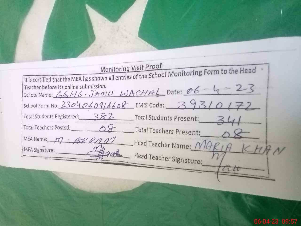 | Attendance Register | Head Teacher | MEA with School | Visit Proof |