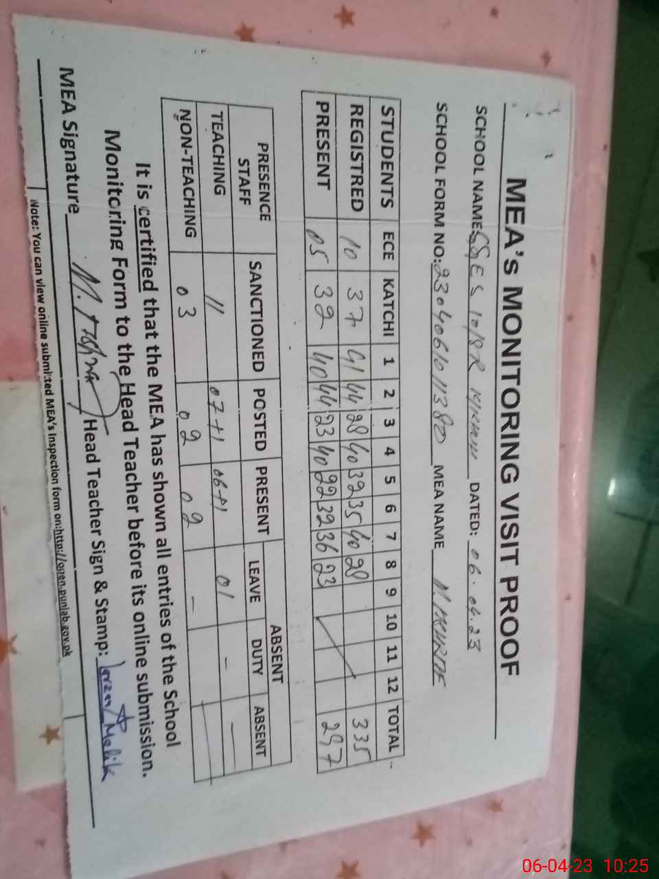 | Attendance Register | Head Teacher | MEA with School | Visit Proof |
