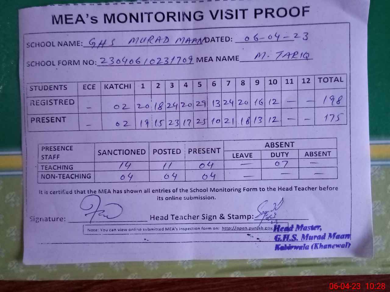 | Attendance Register | Head Teacher | MEA with School | Visit Proof |