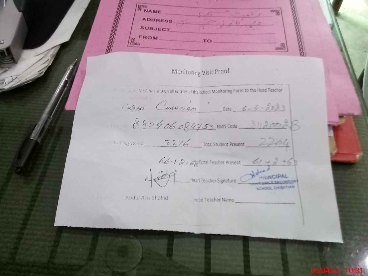 | Attendance Register | Head Teacher | MEA with School | Visit Proof |